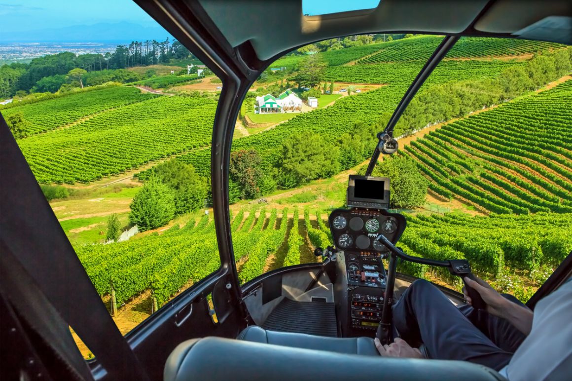 Helicopter view of green fields below.