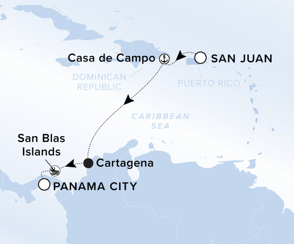 Sail from San Juan to visit the exclusive resort of Casa de Campo in the Dominican Republic. Explore the UNESCO World Heritage walls surrounding charming Cartagena and, with an overnight stay, enjoy a relaxing evening wandering the city's illuminated plazas. The pristine coral atolls of the San Blas Islands are next, delivering a dose of remote island tranquility ahead of an unforgettable day spent transiting the Panama Canal.
