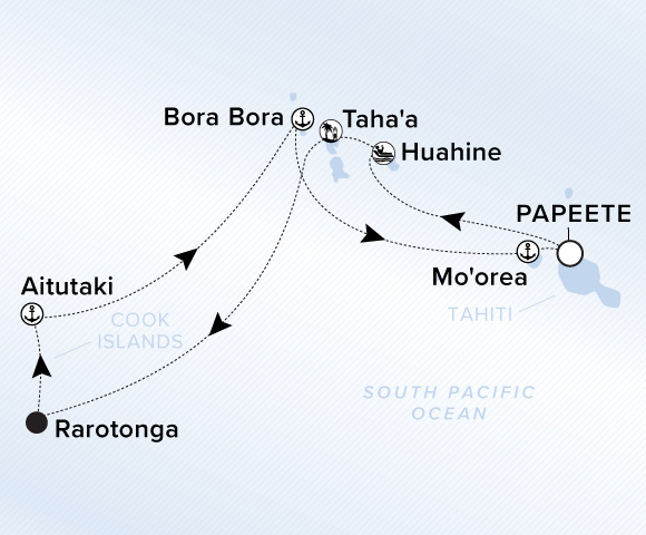 A map of the South Pacific Ocean. A line starts in Papeete and goes to Huahine, Taha'a, Rarotonga, Aitutaki, Bora Bora, Mo'orea, and ends back in Papeete.