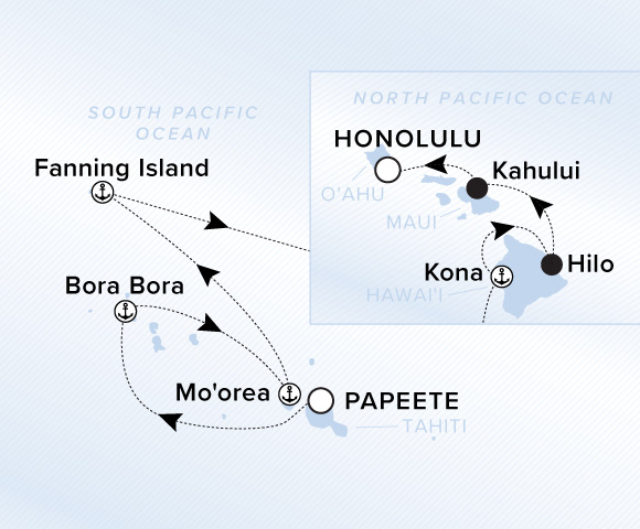 A map of the North and South Pacific Ocean. A line starts in Papeete and goes to Mo'orea, Bora Bora, Fanning Island, Kona, Hilo, Kahului, and ends back in Honolulu.