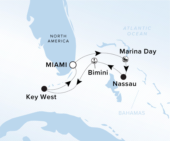 A map of the Atlantic Ocean. A line starts in Miami and goes to Nassau, Great Exuma, Key West, and ends back in Miami.