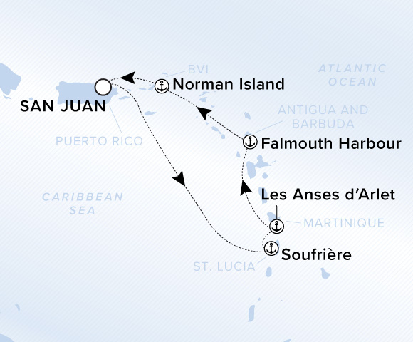 A map of the Atlantic Ocean and Caribbean Sea. A line starts in San Juan and goes to Soufriere, Les Anses d'Arlet, Gustavia, Norman Island, and ends back in San Juan.