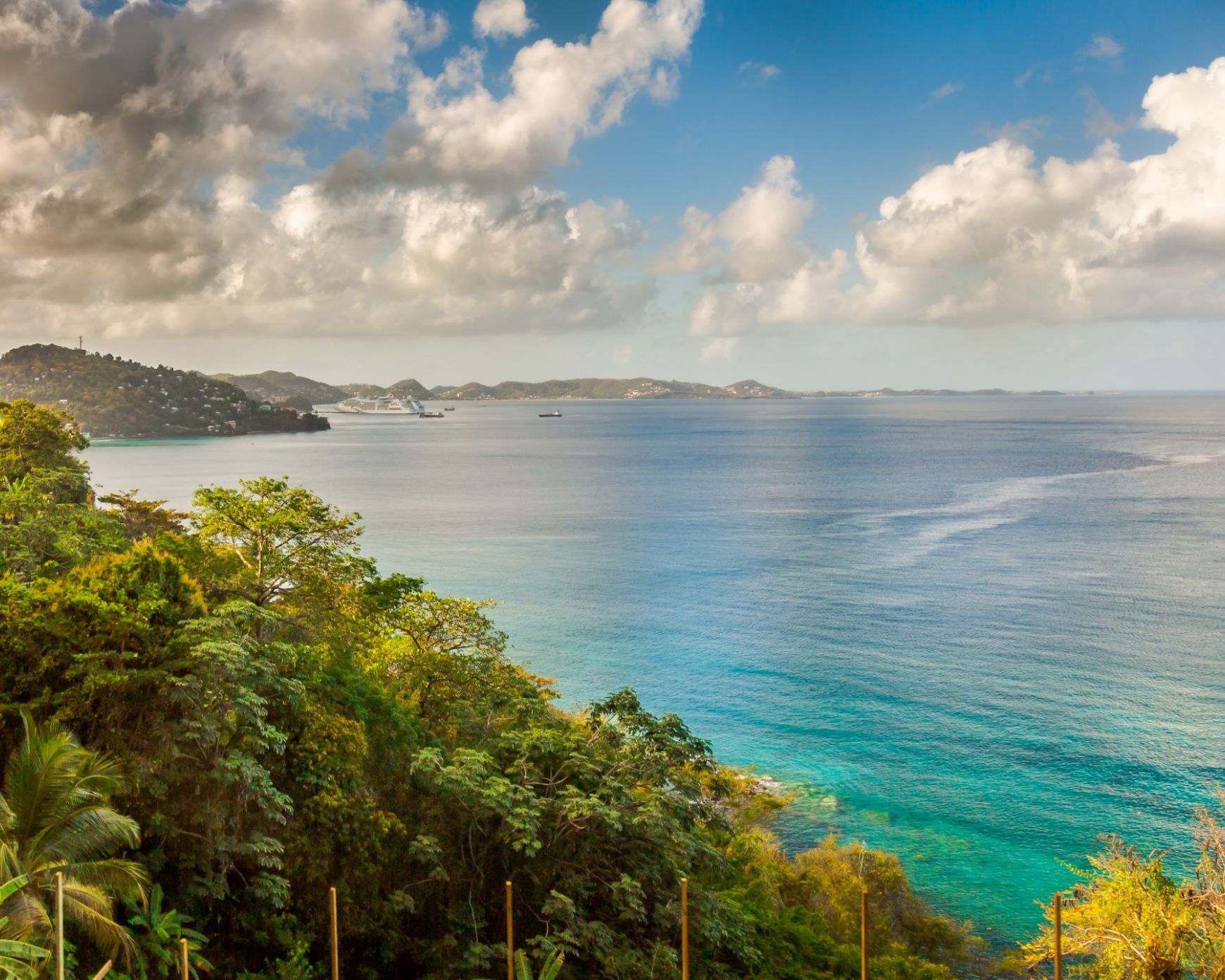 A map of the Atlantic Ocean and Caribbean Sea. A line starts in San Juan and goes to St. George's, Canouan, Soufriere, Gustavia, St. John and ends back in San Juan.