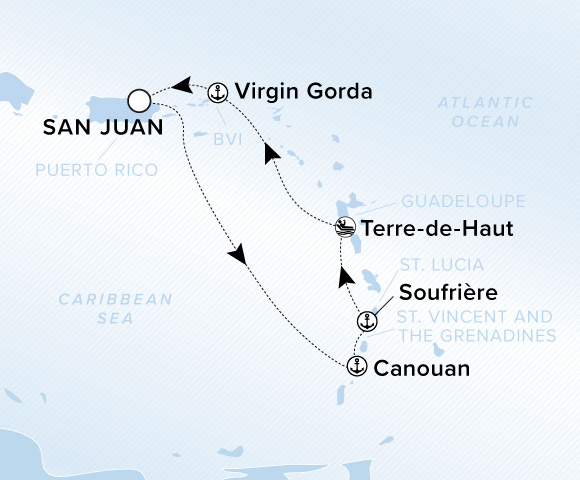 Dramatic contrasts define this 6-night Caribbean voyage, from the serene white-sand shores of Canouan to the volcanic silhouettes of the Pitons in Soufrière on St. Lucia. Enjoy a Marina Day in Terre-de-Haut in the Îles des Saintes, then continue to Virgin Gorda to explore its striking granite boulders and turquoise grottoes before returning to San Juan.