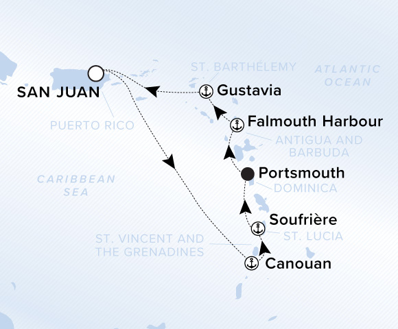 A map of the Atlantic Ocean and Caribbean Sea. A line starts in San Juan and goes to Canouan, Soufriere, Portsmouth, Falmouth Harbour, Gustavia, and ends back in San Juan.