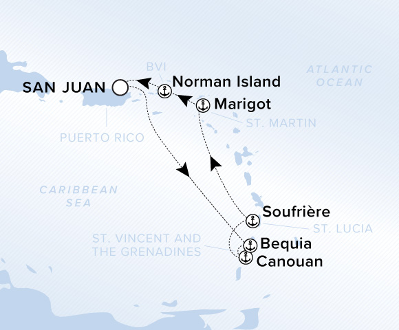 A map of the Atlantic Ocean and Caribbean Sea. A line starts in San Juan and goes to Bequia, Canouan, Soufriere, Marigot, Norman Island, and ends back in San Juan.