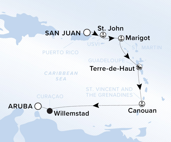This 7-night Caribbean sailing highlights the region’s most distinctive destinations. In St. John, protected beaches and coral reefs within Virgin Islands National Park invite swimming and snorkeling. Discover French-Caribbean charm in Marigot and enjoy a Marina Day in Terre-de-Haut, while Canouan offers quiet white-sand beaches. Willemstad’s pastel-hued harbor reveals Dutch-Caribbean character before the journey concludes on the wide shores of Aruba.