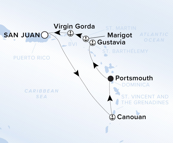 A map of the Atlantic Ocean and Caribbean Sea. A line starts in San Juan and goes to Canouan, Portsmouth, Gustavia, Marigot, Virgin Gorda, and ends back in San Juan.