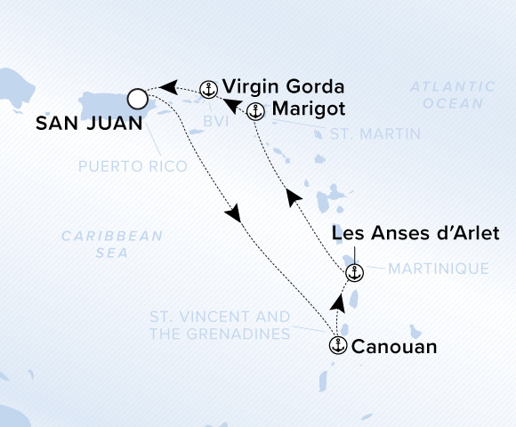 A map of the Atlantic Ocean and Caribbean Sea. A line starts in San Juan and goes to Canouan, Les Anses d'Arlet, Marigot, Virgin Gorda, and ends back in San Juan.