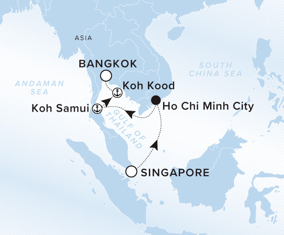 This weeklong Southeast Asia sailing begins in Singapore, then head north to Ho Chi Minh City for a glimpse of its bustling markets and the celebrated street food scene. The journey continues to Thailand’s islands, with an overnight stay in Koh Samui allowing time to linger on palm-fringed beaches, visit hilltop temples, and ease into island life. From there, swim off the quiet shores of Koh Kood, before concluding near Bangkok at Laem Chabang.