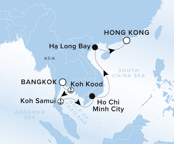 A map of the Andaman Sea and South China Sea. A line starts in Bangkok and goes to Koh Kood, Koh Samui, Ho Chi Minh City, Ha Long Bay, and ends back in Hong Kong.