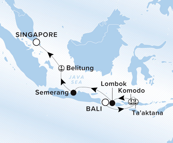 A map of the Java Sea. A line starts in Bali and goes to Ta'aktana, Komodo, Lombok, Semerang, Belitung, and ends back in Singapore.
