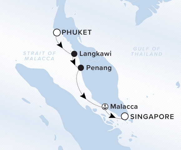 Depart Phuket to sail through the Andaman Sea en route to Langkawi. On this Malaysian island, explore mangrove forests and the caves of Kilim Karst Geoforest Park, then continue to Penang, known for its historic streets and celebrated food culture, before concluding in Singapore.