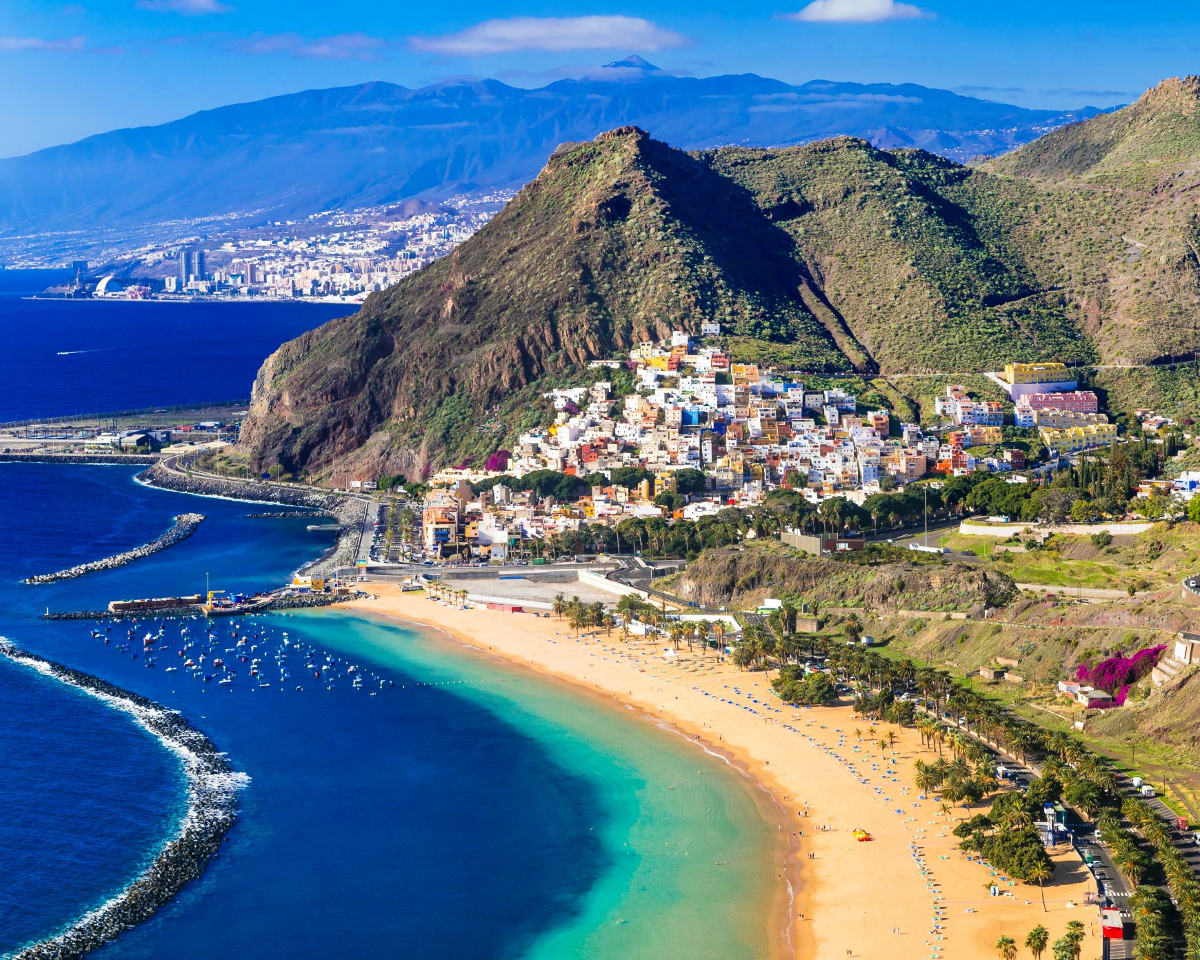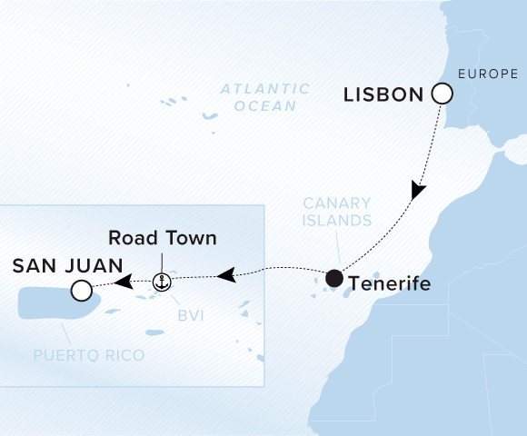 A map of the Atlantic Ocean. A line starts in Lisbon and goes to Tenerife, Road Town, and ends in San Juan.