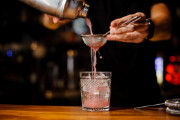 The foreground of a pink cocktail that is prepared with ice.