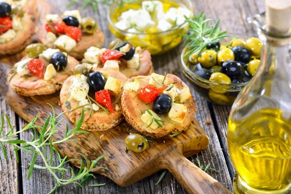 Bruschetta served on a wooden chopping board with cheese, olives, and tomato.