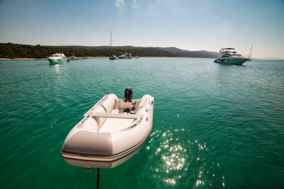 A small dinghy in the middle of the transparent sea.
