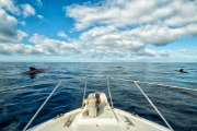 The view from an open sea boat with dolphins.