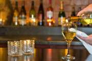 White wine being poured into a glass on a wooden counter.