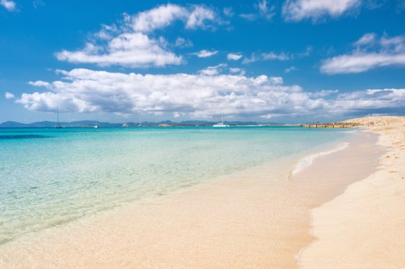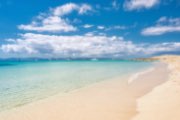 A large white beach with crystal clear waters.