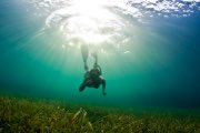 A woman snorkeling underwater, exploring a seagrass bed.
