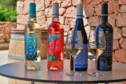 Four bottles of wine in the foreground, ranging from white, rosé and red.
