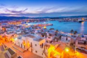 A bird's-eye view of whitewashed buildings surrounding a harbor at dusk.