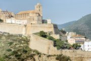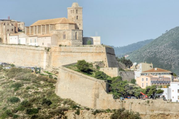 Sand stone ramparts, buildings and 13th century cathedral on top of a cliff.