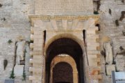 A tan stone wall featuring an archway into a fortified city, bordered by ancient statues.