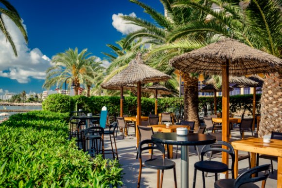 Black bistro tables on a patio by the waterfront, shaded by umbrellas and palm trees.