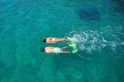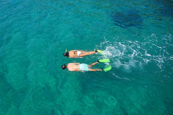 A top-down view of a man and woman snorkeling through bright blue waters.