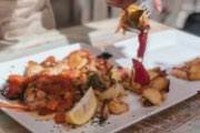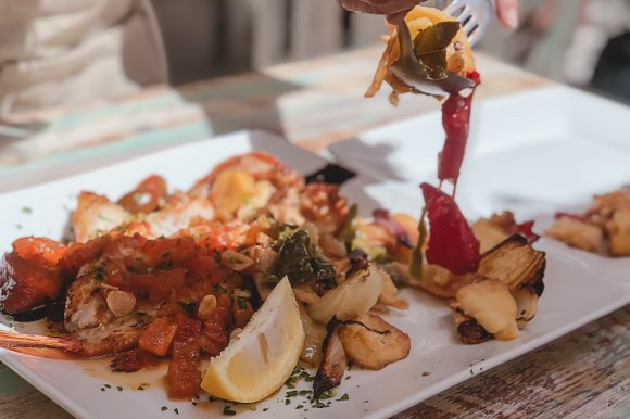 A plate of Mediterranean seafood, vegetables and a tomato sauce.