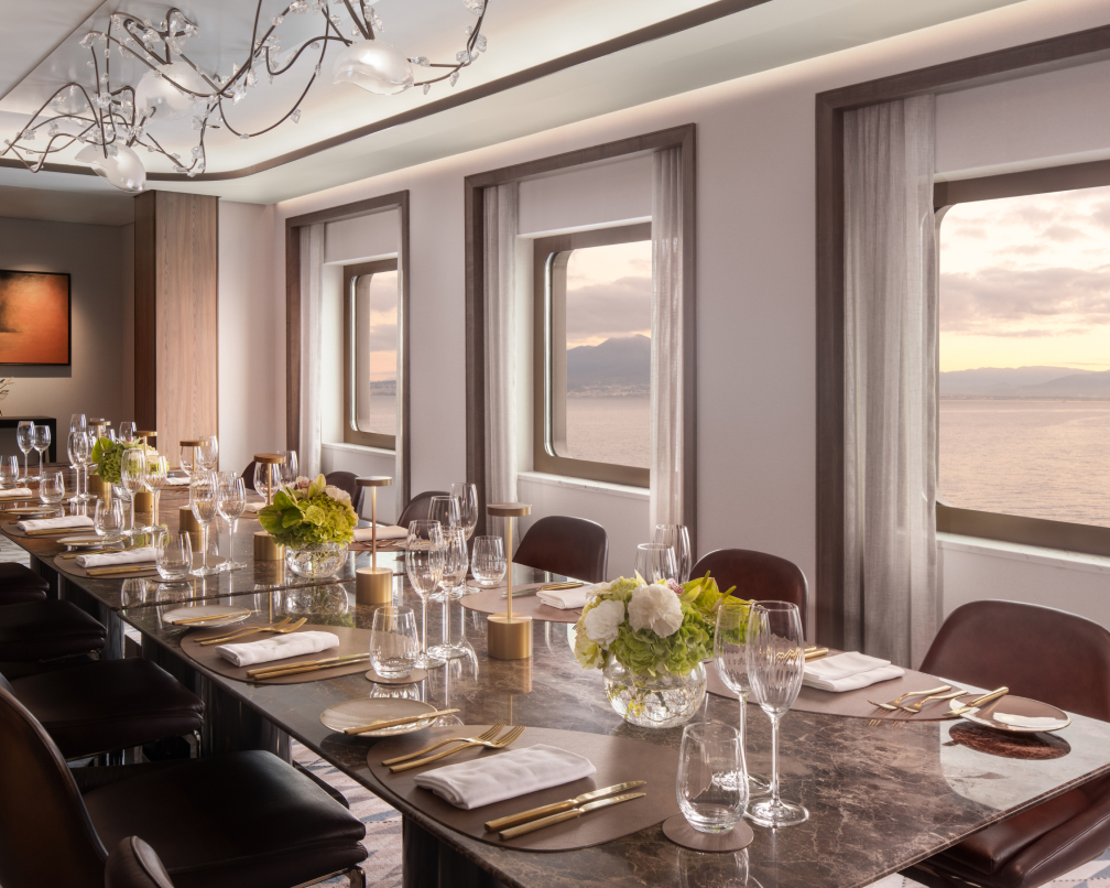 Dining Privée is an intimate enclave within Azur, ideal for celebratory dinners, hosted gatherings or an evening with friends. Soft lighting and refined finishes create a warm, contemporary ambiance. Curated menus reflect the seasonal approach and regions explored aboard Luminara, offering a personal, elevated private dining experience.