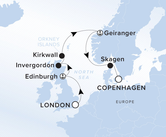 This journey combines the beauty of the Scottish Highlands with Norway’s spectacular fjords. Spend two days in Edinburgh exploring the capital’s Royal Mile before sailing for the atmospheric ruins of Urquhart Castle on the shores of Loch Ness near Invergordon. Then sip a dram of whisky at the Highland Park distillery in Kirkwall en route to the UNESCO World Heritage site of Geirangerfjord. In Måløy, the final port before Copenhagen, explore the city’s seaside by trying coasteering, or guided hopping and climbing along the scenic rocky shoreline.