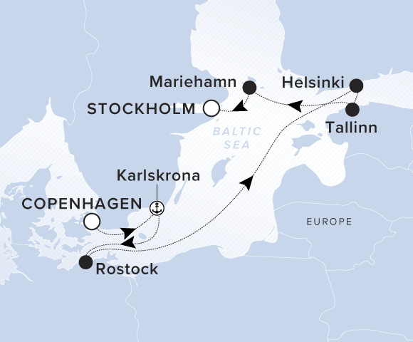 Set off from Copenhagen for Rostock, which offers access to the German capital of Berlin and icons like Brandenburg Gate and the East Side Gallery. Then explore the seat of Finnish government in Helsinki before relaxing in one of the country’s traditional saunas. The historic center of Estonia’s capital is a UNESCO World Heritage site of exceptional medieval architecture, and the journey concludes on the scenic canals of Stockholm.