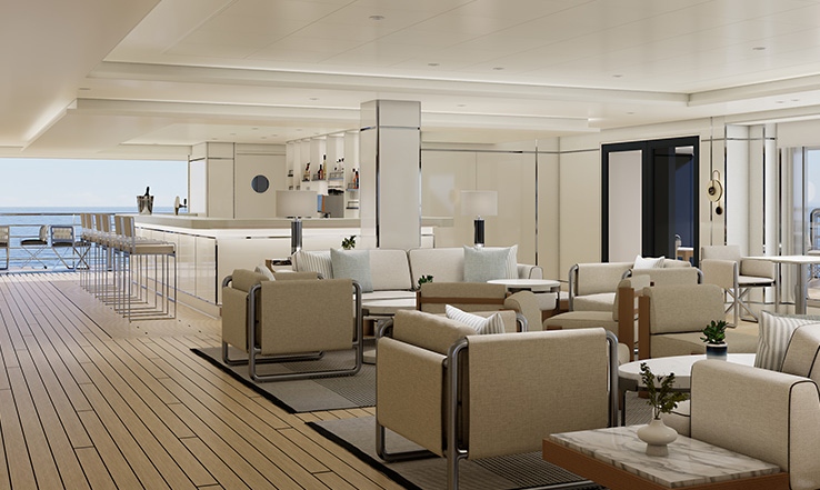 At the heart of Luminara is The Living Room, an indulgent central area where impeccable service and comfortable design intuit your every desire as the space transforms from daytime coffee bar to a cocktail lounge with live music in the evening. Its showpiece lighting feature, an overhead marvel of intricately hand-blown jellyfish forms by the bespoke Czech glass house Lasvit, continues over the inviting bar. Steps away on deck 5, the Beach House offers a relaxed space for indoor and outdoor dining that extends into a glittering infinity pool, while the lower-deck Marina, a go-to lounge spot offering direct sea access, and the expansive Marina Terrace, are among the most prized spots to see and be seen.