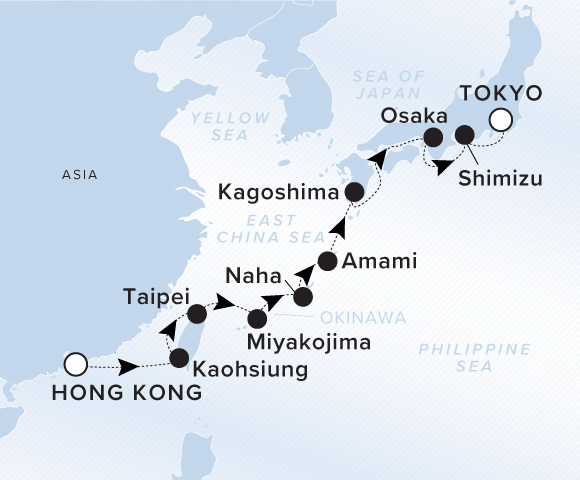 A map of the Sea of Japan, Yellow Sea, Philippine Sea, and East China Sea. A line starts in Hong Kong and goes to Taipei, Miyakojima, Naha, Motobu, Amami, Kagoshima, Osaka, Shimizu, and ends in Tokyo.